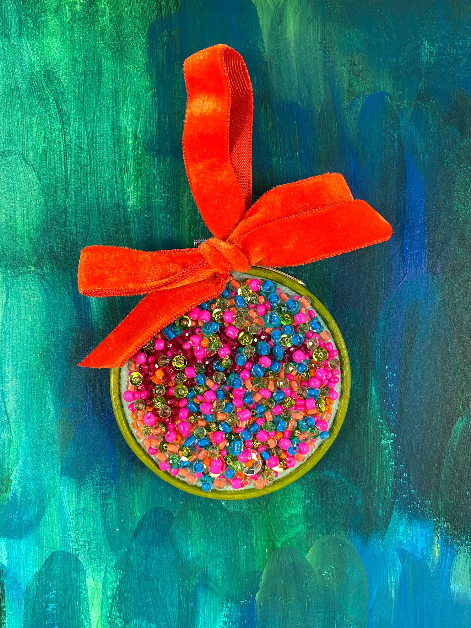 One-of-a-kind 3” embellished abstract textile in a painted hoop, adorned with a velvet ribbon from The Wondermakers Collaboration by Mindy Meyers and Jenna Freimuth.