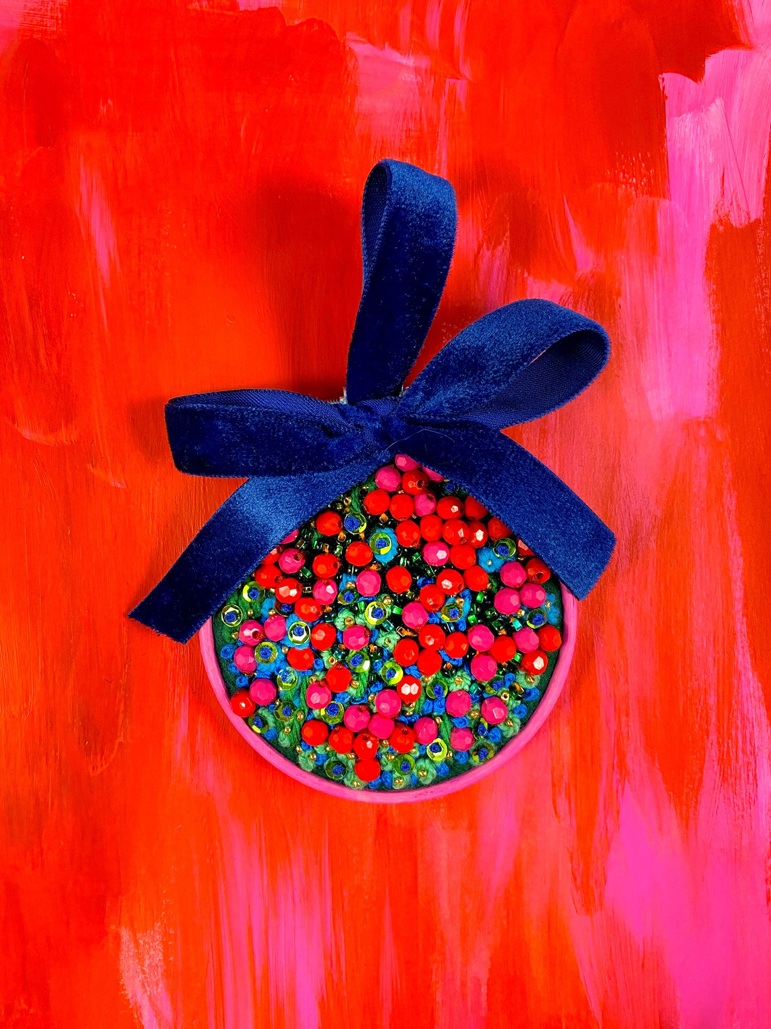 One-of-a-kind 3” embellished abstract textile in a painted hoop, adorned with a velvet ribbon from The Wondermakers Collaboration by Mindy Meyers and Jenna Freimuth.